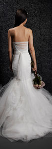 Strapless bodice and subtle waist bandeau that ties at the back. Frothy skirt that tumbles from the lower thigh.